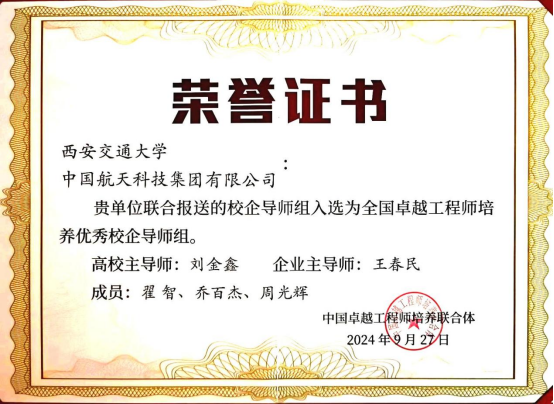 9月27日,西安交大、中国航天科技集团有限公司校企导师组获中国卓越工程师培养联合体颁发的人才培养全国优秀校企导师组荣誉证书(全国10项)。