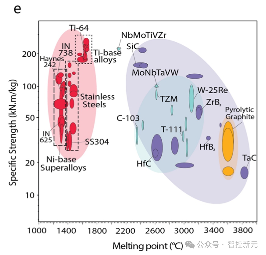 然而,熔点并非结构设计的唯一决定性参数。以碳-碳材料为例,其在常压下虽不会熔化,但会在3727°C升华,并在低至约370°C时即开始氧化生成气态CO。与所有航空材料相同,密度、抗氧化能力及热机械载荷耐受性均为关键考量因素(图2c)。镍基合金通过共格析出强化与高温自钝化效应,可在接近熔点的温度区间保持性能稳定;而钨与钼在2000°C时仍能维持50%以上的弹性模量,但其三氧化物在高温下的高蒸汽压导致材料在1000°C以下即发生急剧氧化,且氧化速率随温度升高呈指数增长。当前先进难熔合金尚无法同时具备镍/钴基合金的多重性能优势,这严重制约了其实际应用潜力。
