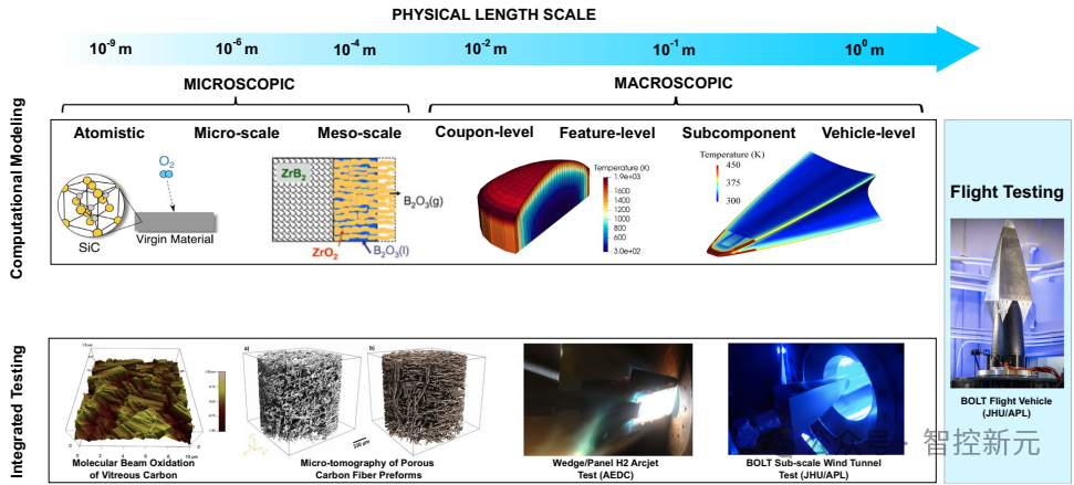 图4 | 材料设计与飞行测试的多尺度建模与测试框架,建模和测试方法的长度尺度跨越了许多数量级,较小尺度的模型为更大规模的测试提供信息并验证其成功