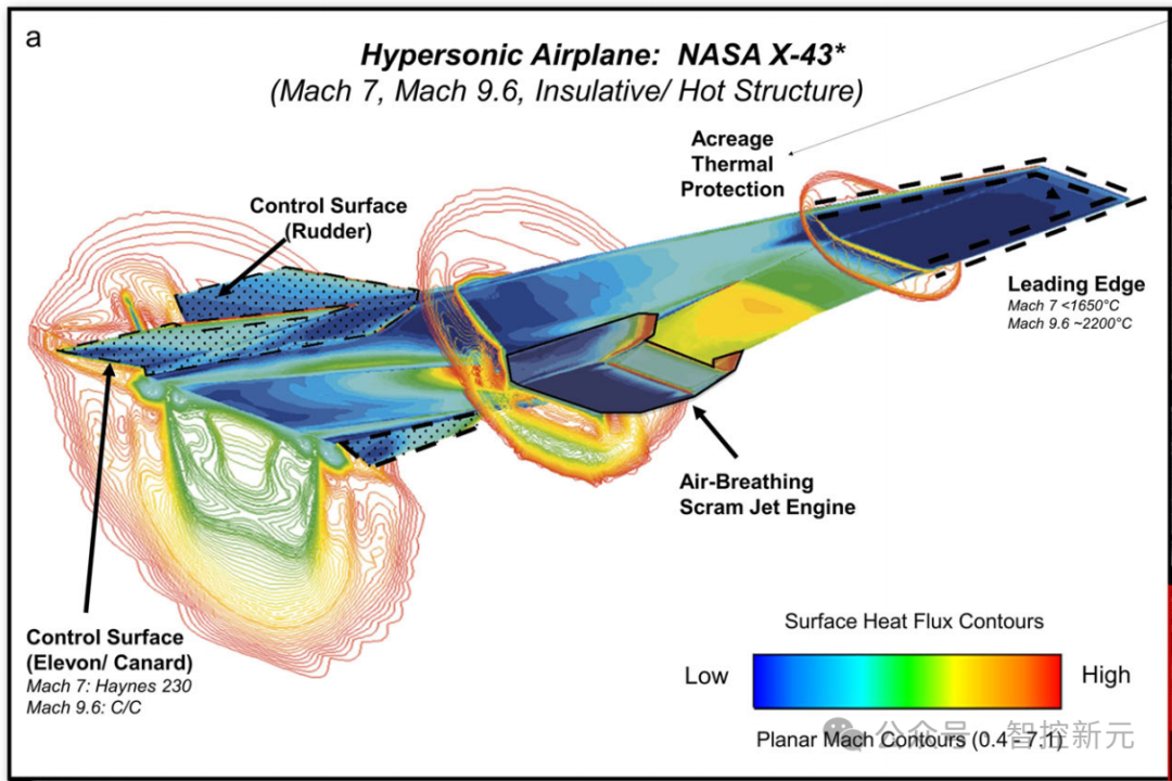 子图a):针对X-43飞行器在马赫7测试工况的CFD模拟结果显示发动机运行状态,该数值解算涵盖内部流场(吸气式超燃冲压发动机)与外部流场的耦合分析,包含发动机尾流与飞行器气动布局的相互作用。可视化图像显示飞行器表面热传递分布(红色区域表征最高热载荷)以及局部马赫数条件下的流场形态特征。