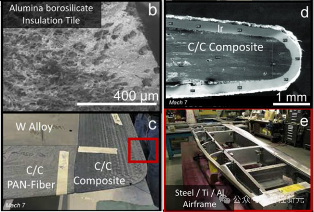 子图e):由钢/铝合金蒙皮与铝/钛合金框架构成的飞行器主体结构。
