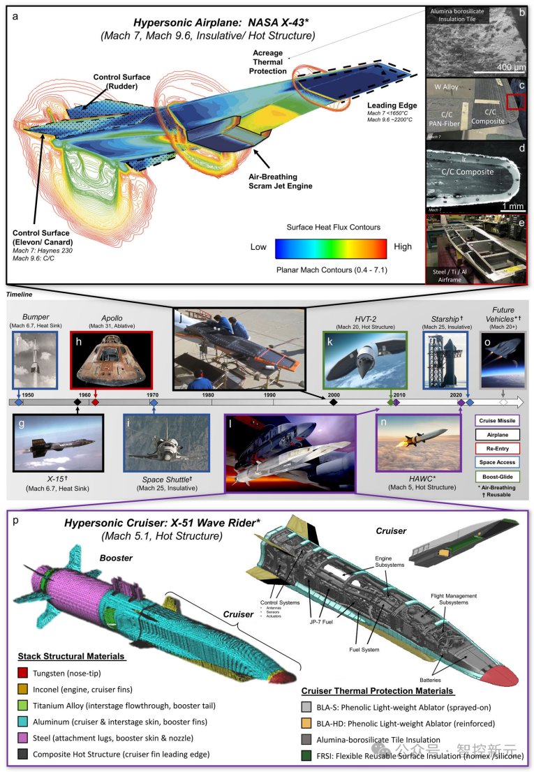 图1 | 高超音速飞行器发展历程及升力体(飞机)与巡航构型飞行器关键子系统和材料体系概览
