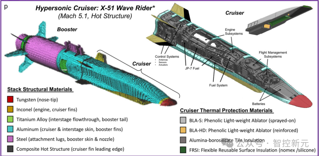 子图p): X-51高超音速平台结构与热防护材料分布示意图。高超音速巡航器X-51(马赫 5.1,热结构),二级为巡航器,一级为助推器,包含发动机子系统、飞行管理控制系统子系统、JP-7 燃料与燃料系统。