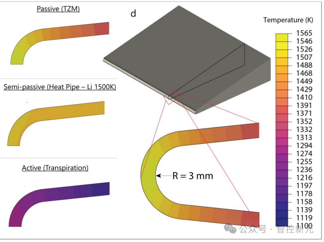 子图b): 半被动前缘(左)和热分布(右)的示意图,半被动的锂热管在1500开尔文下运行;
