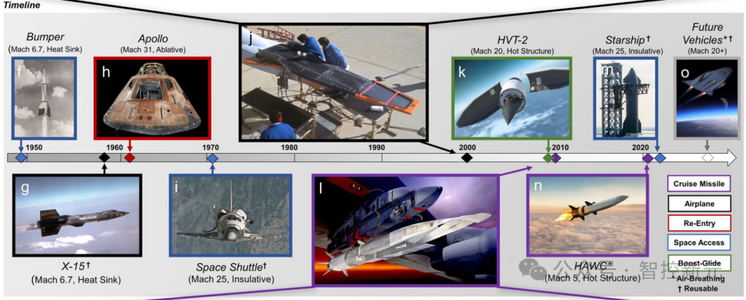高超音速飞行器发展时序轴涵盖超音速飞机、太空进入、再入返回、助推-滑翔飞行器及巡航导弹等应用领域,颜色编码对应不同构型。