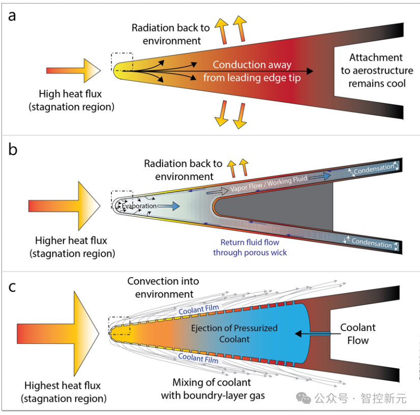 主动热防护系统采用强制流动的液体或蒸汽,用于最极端的热通量和长时间的飞行。这些系统包括:(i)对流冷却,将热量传递到工作流体(例如,航天飞机主发动机);(ii)气膜冷却,通过将流体喷射到大面积的流动中以形成隔热毯(例如,X-43推进系统);(iii)蒸腾冷却,通过多孔结构将流体(例如,水或氦)喷射到高温气流中进行冷却。这些示例出现在图1a、i、j中。