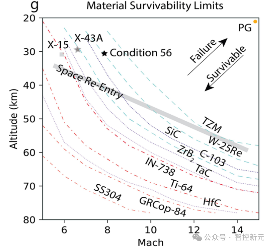 子图g):不同飞行条件下的(f)的顶点被展示为一个假设的高超音速飞行高度-马赫图,其中每条线代表具有这种特定(陡峭)楔形几何形状的单体材料的“生存极限”,值得注意的是纵坐标是高度逐渐降低的描述,也就是说高度越低、速度越快,材料面临的挑战和失效风险越大;在途中X-43A、X-15的已知飞行条件以及典型的空间再入情况被标出以供参考。