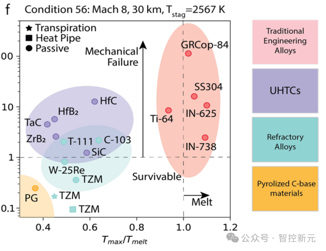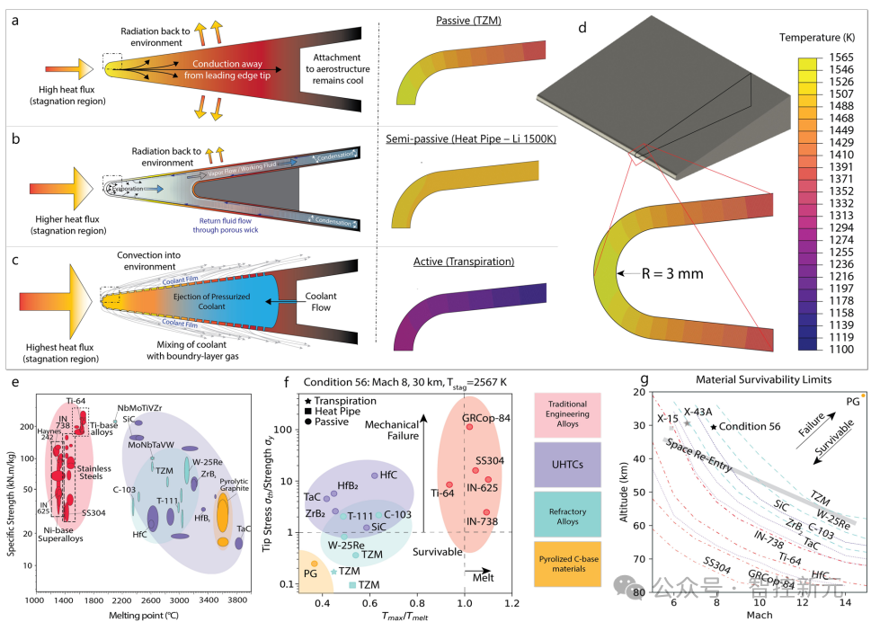 子图f): 被动前缘有限元模拟结果的阿什比风格图表,其中:y轴是由热膨胀梯度产生的归一化机械应力,x轴是在热通量最高处的尖端归一化峰值温度。从温度角度来看,只有4种材料(IN-738、IN 625、SS304、GCop-84)可行(忽略氧化),而8种材料(Ti-64、SiC、C-103、T-I11、ZrB2、TaC、HfB2和HfC)不可行,因为膨胀应力超过了该温度下材料的屈服强度。通过氧化作用产生的限制会降低整体的最大运行温度;这些材料的氧化动力学可用性有限。