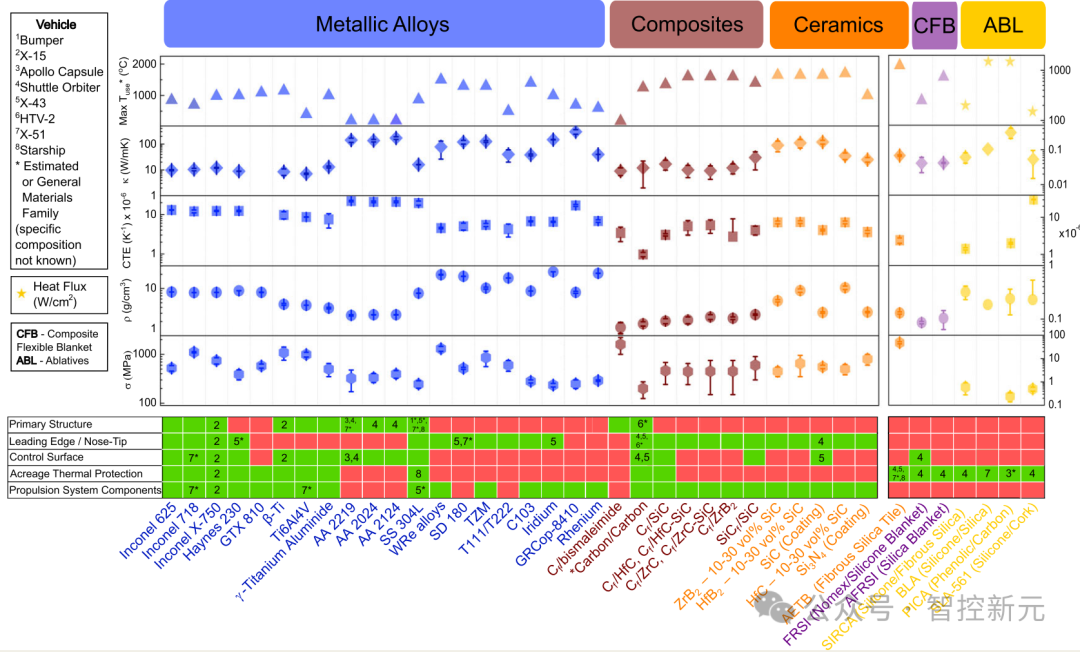 表1:表中列出了金属合金、复合材料、陶瓷及合成材料在室温环境下的关键性能参数,包括:拉伸强度(σTS)、屈服强度(σy)、弯曲强度(σFS)、密度(ρ)、热膨胀系数(CTE)、热导率(κ)等。对应给出了材料的预估使用温度(T)与热通量(Q)极限值。部分材料数据因获取途径有限存在缺失,且材料性能的部分波动与其编织方式、复合结构及加工工艺密切相关。带框数字对应图1所示飞行器实际采用的材料编号,误差线表示文献数据中性能参数的上下限范围,符号中心点代表估算平均值。