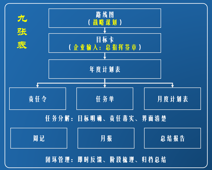 九张表是以路线图(Road map)、目标卡(Target card)、年计划表(Annual plan)、月计划表(Monthly schedule)、责任令(Responsibility agreement)、任务单(Task list)、周记(Weekly record)、月报(Monthly report)、总结报告(Personal/Projectsummary)落实有组织科研闭环管理的举措,是西安交通大学与航天科技六院产教融合创新联合体创立的“新港三融”模式的重要内涵。