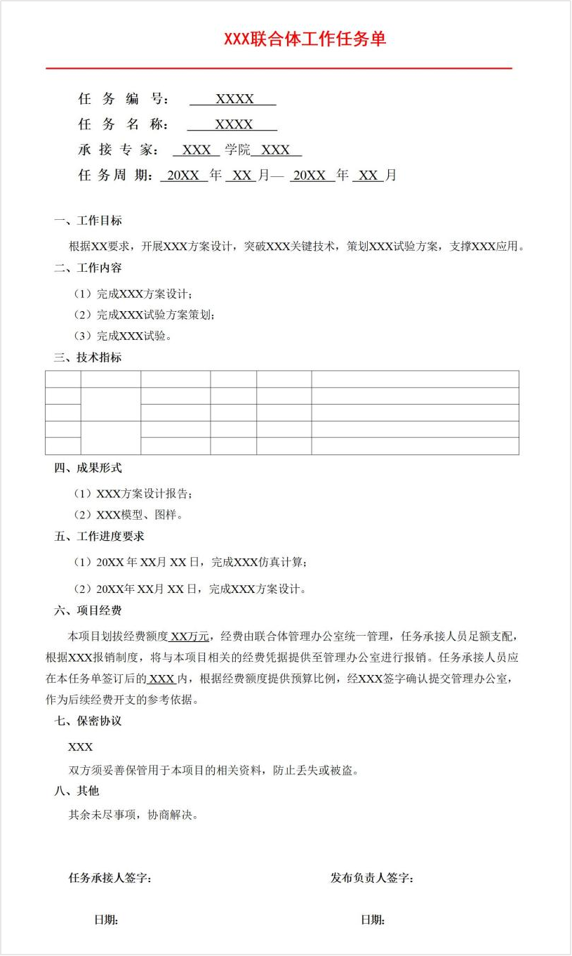 (6)任务单(Task list):柔性参与联合体任务的校方教授/独立PI团队,任务单约定任务的内容和所需的资源(经费、试验资源),由管理办公室在联合体范围内进行配置和管理。任务单内容由承接人和联合体技术方向对接人进行任务协商,形成任务单内容、成果形式、时间节点,并按照规定的时间节点在每一阶段完成相应的汇报,最终形成总结报告,任务单的周期一般不长于6个月。