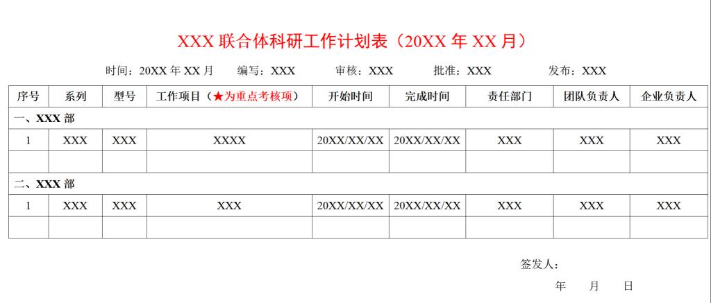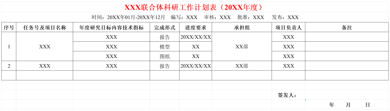 (4)月计划表(Monthly schedule):依据年计划表,联合体各方向(班组/技术部)负责人细化每月的具体任务安排,将任务安排落实到个人,全职参与联合体的校企双方人员需纳入计划表任务安排,其中校方纳入计划表管理的人员为“校招共用”的专职科研队伍、聘为联合体“研究助理”的联合培养研究生,企方纳入计划表管理的人员为企业原攻关队伍人员。由专职的管理办公室负责统一发布每月计划表。