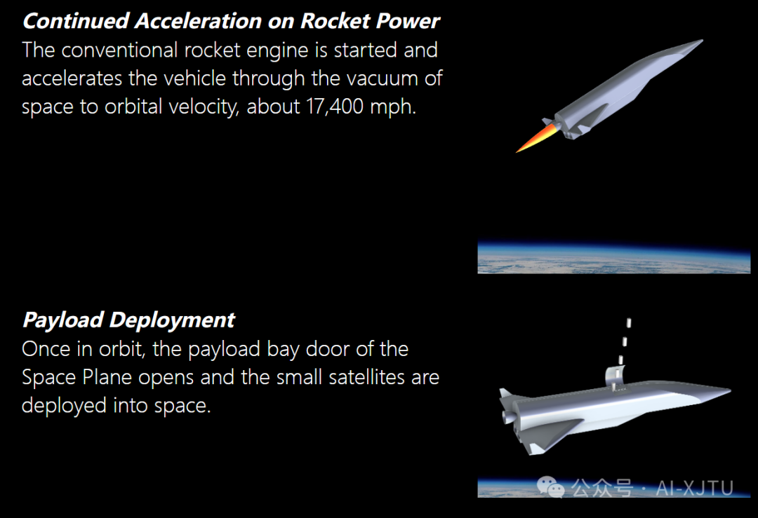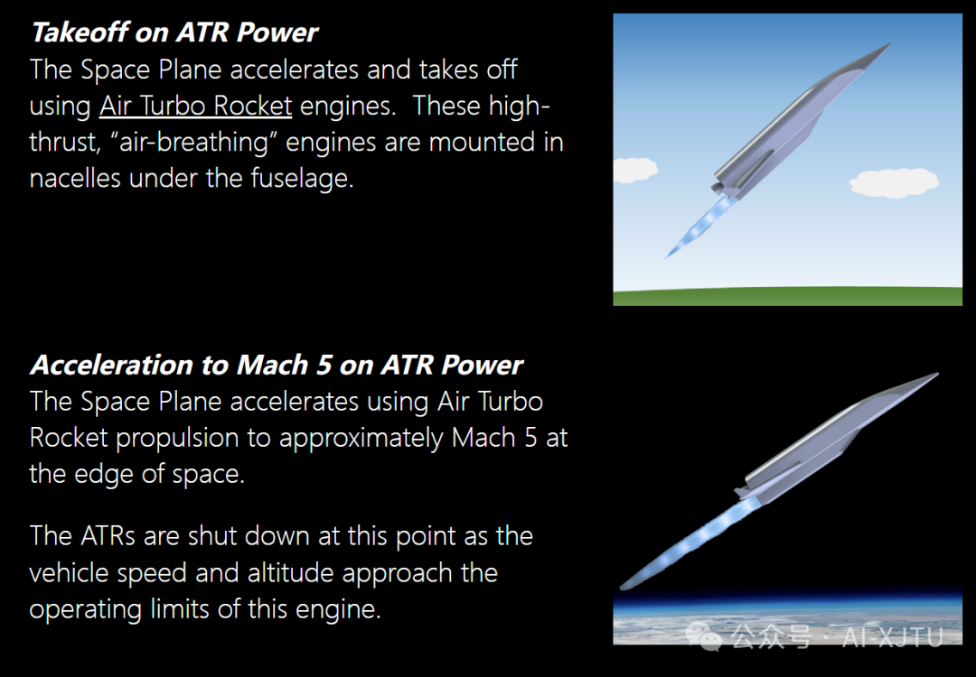 4. ATR动力加速到马赫5:太空飞机使用空气涡轮火箭推进加速到接近马赫5的速度,位于临近空间。此时,ATR发动机关闭,因为飞行器的速度和高度接近该发动机的工作极限。