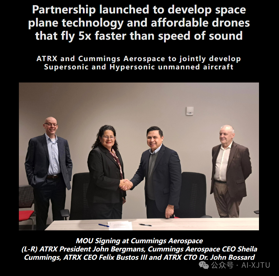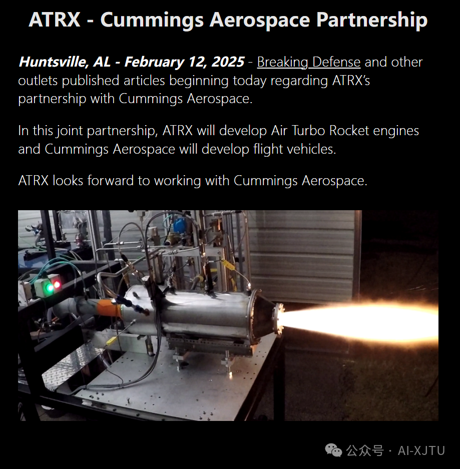商业活动 2025年2月,美国阿拉巴马州国防工程企业Cummings Aerospace与加州航天科技新锐ATRX公司达成战略合作,宣布共同开发一款最高速度达5倍音速的无人机系统(UAS)。该无人机将以Cummings为美国陆军开发的Hellhound亚音速无人机为基础,集成ATRX革命性的空气涡轮火箭(ATR)推进系统,旨在为美军及其盟友提供低成本、高生存性的高超音速侦察/打击平台,同时为未来可重复使用太空飞机技术铺路。