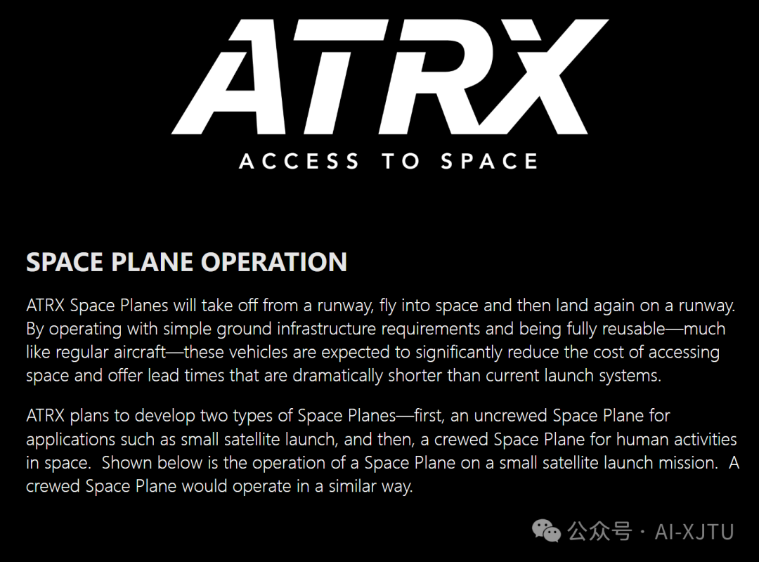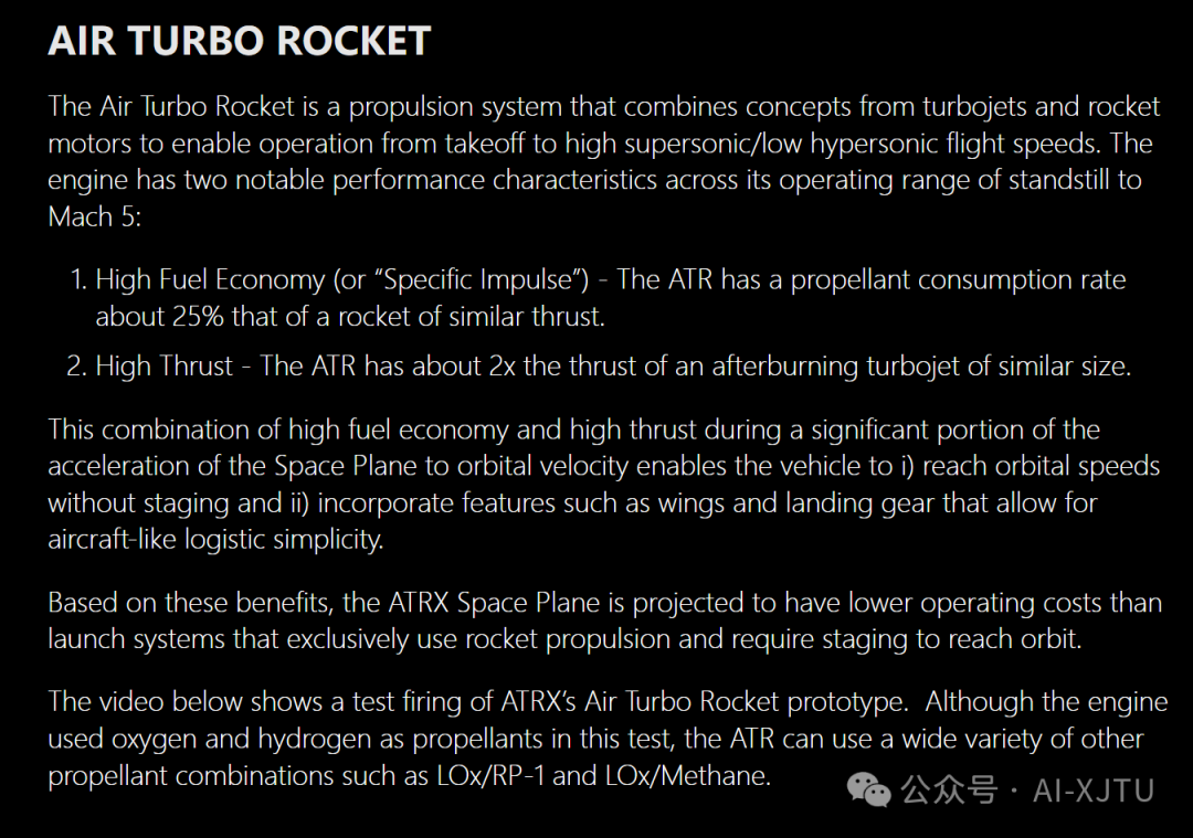 空气涡轮火箭发动机(Air Turbo Rocket,简称ATR)是一种结合了涡轮喷气发动机和火箭发动机原理的推进系统,能够实现从起飞到高超音速(5马赫)的全程高效运行。该发动机在静止状态至5马赫的工作范围内具有两大显著性能优势:(1)高燃料经济性(高比冲),ATR的推进剂消耗率约为同等推力火箭发动机的25%。(2)高推重比,ATR的推力可达同尺寸加力燃烧涡轮喷气发动机的约2倍。通过在高超音速加速阶段同时实现高燃料效率和强推力,ATR使得空天飞机能够无需多级分离即可达到轨道速度、集成机翼、起落架等航空器特征、大幅降低运营复杂度。基于这些优势,ATRX太空飞机的预计运营成本将显著低于依赖多级火箭推进的传统入轨系统。