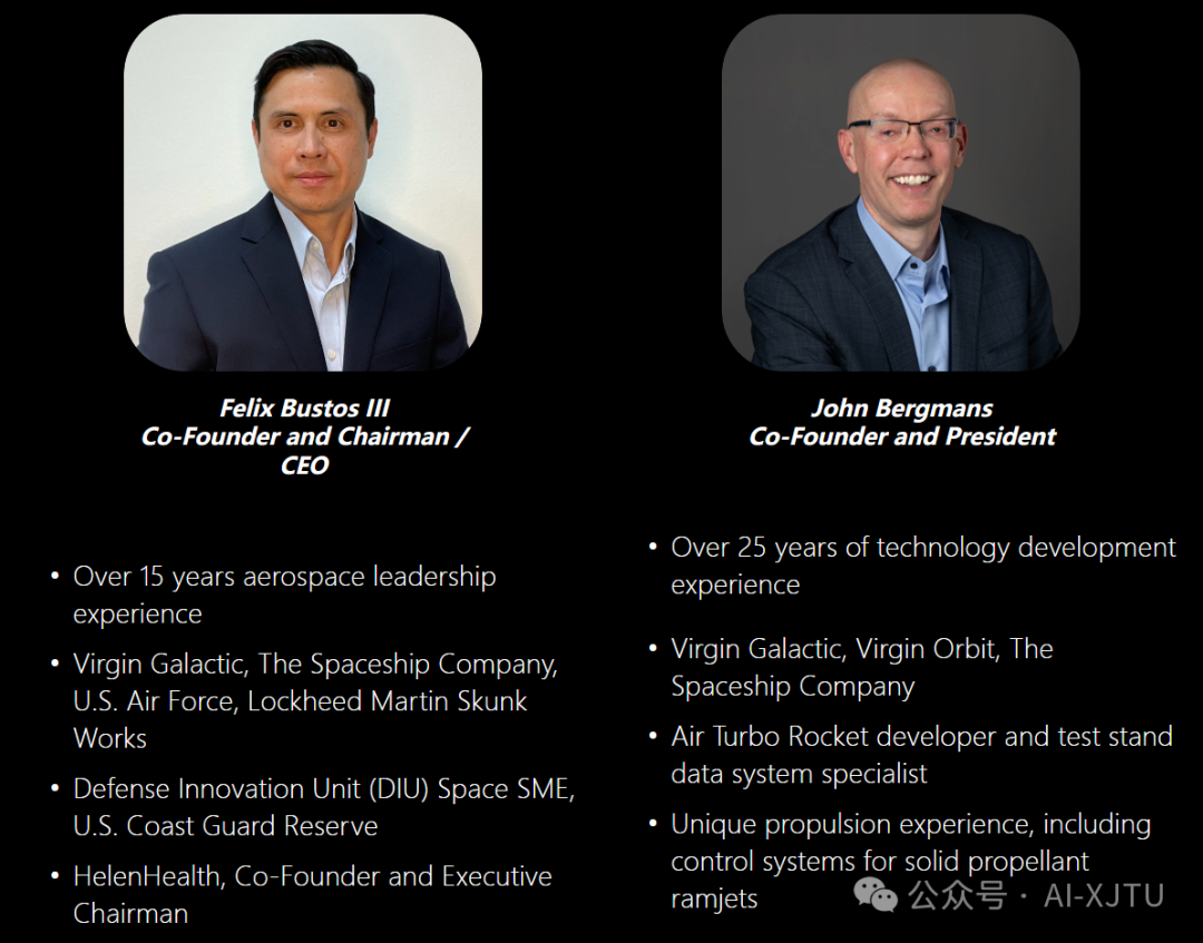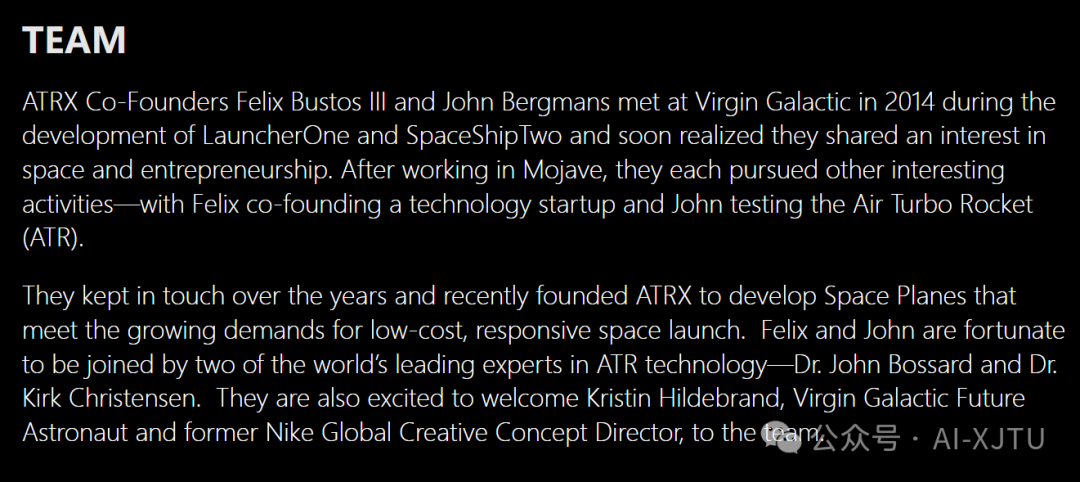 ATRX联合创始人Felix Bustos III和John Bergmans于2014年在维珍银河公司开发LauncherOne运载火箭和SpaceShipTwo太空船期间相识,并很快发现彼此对太空探索与创业精神志趣相投。在Mojave共事后,两人分别投身其他创新事业——Felix参与创立了一家科技初创公司,John则专注于空气涡轮火箭(ATR)的测试工作。多年来他们保持密切联系,近期共同创立ATRX公司,致力于研发满足市场对低成本、快速响应航天发射需求日益增长的太空飞机。值得庆幸的是,两位全球顶尖ATR技术专家John Bossard博士和Kirk Christensen博士已加入团队。此外,团队还迎来了Kristin Hildebrand——维珍银河未来宇航员、前耐克全球创意概念总监,她的加盟令整个团队倍感振奋。