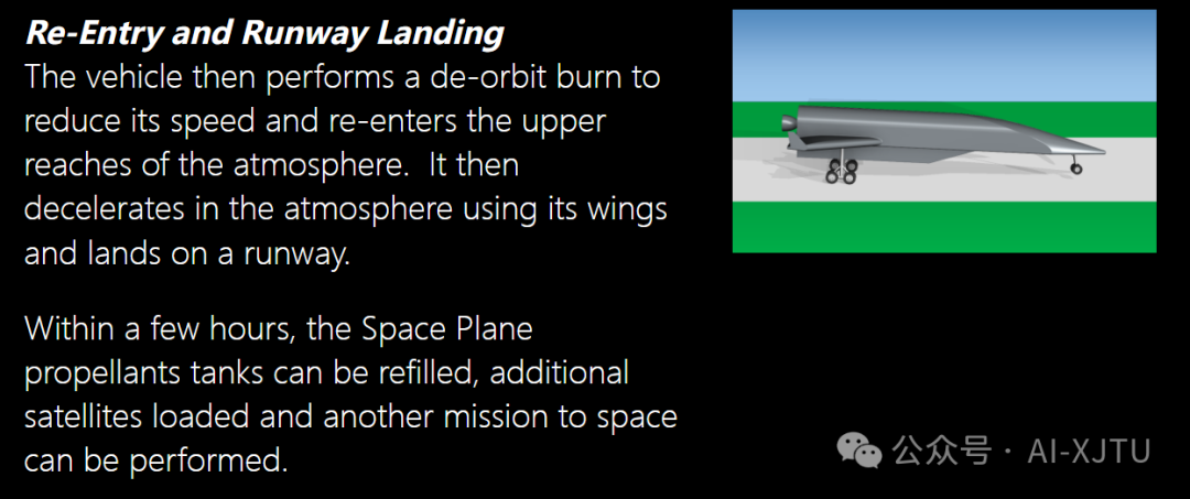 太空飞机运行模式:ATRX太空飞机将从跑道起飞进入太空,随后再次在跑道上着陆。由于其对地面基础设施的需求较为简单且可实现完全重复使用,这种飞行器预计将显著降低进入太空的成本,所需准备时间也远短于现有发射系统,其操作模式与常规飞机非常相似。ATRX计划开发两种类型的太空飞机:首先是用于小型卫星发射等任务的无人驾驶太空飞机,其次是用于支持人类太空活动的载人太空飞机。下图展示的是执行小型卫星发射任务时太空飞机的运行流程,载人版太空飞机的运行方式与此类似。